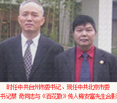 梅安富先生軍人出身(曾經(jīng)在中國馬蘭核試驗基地工作十多年,為核武器發(fā)展做出了卓越貢獻(xiàn)、被評為八級軍殘)、高級經(jīng)濟(jì)師、中共優(yōu)秀黨員、天臺山人氏。現(xiàn)任中共鄭州臺州商會支部委員會書記、常務(wù)副會長兼秘書長、河南省保健品協(xié)會副會長、全國政協(xié)副主席、中共中央委員、中國殘聯(lián)主席鄧樸方先生與鄭州臺州商會支部書記兼秘書長、《百花散》傳人梅安富先生親切交談鄭州市腫瘤康復(fù)協(xié)會名譽會長。2005年5月,作為臺州古代中醫(yī)秘方梅氏《百花散》